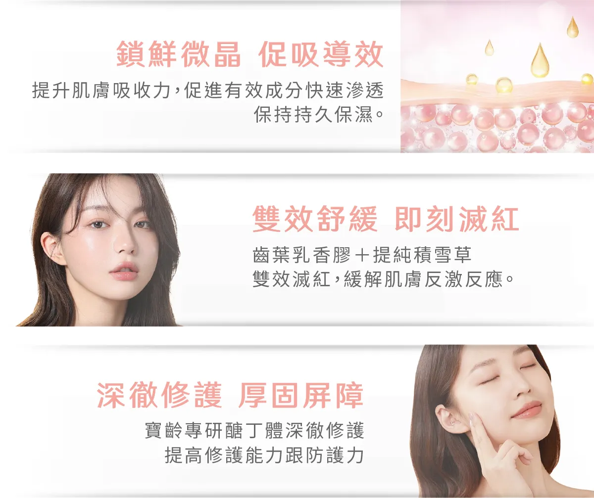 寶齡麗碧雅糖丁體修護回彈精華液專為敏弱肌研製;經權威機構30名敏感肌受試者真人功效驗證,28天有效舒緩褪紅22.4%修護屏障受損18.48 %增厚表皮6.86%促進膠原10.64%緊緻肌膚6.63%。